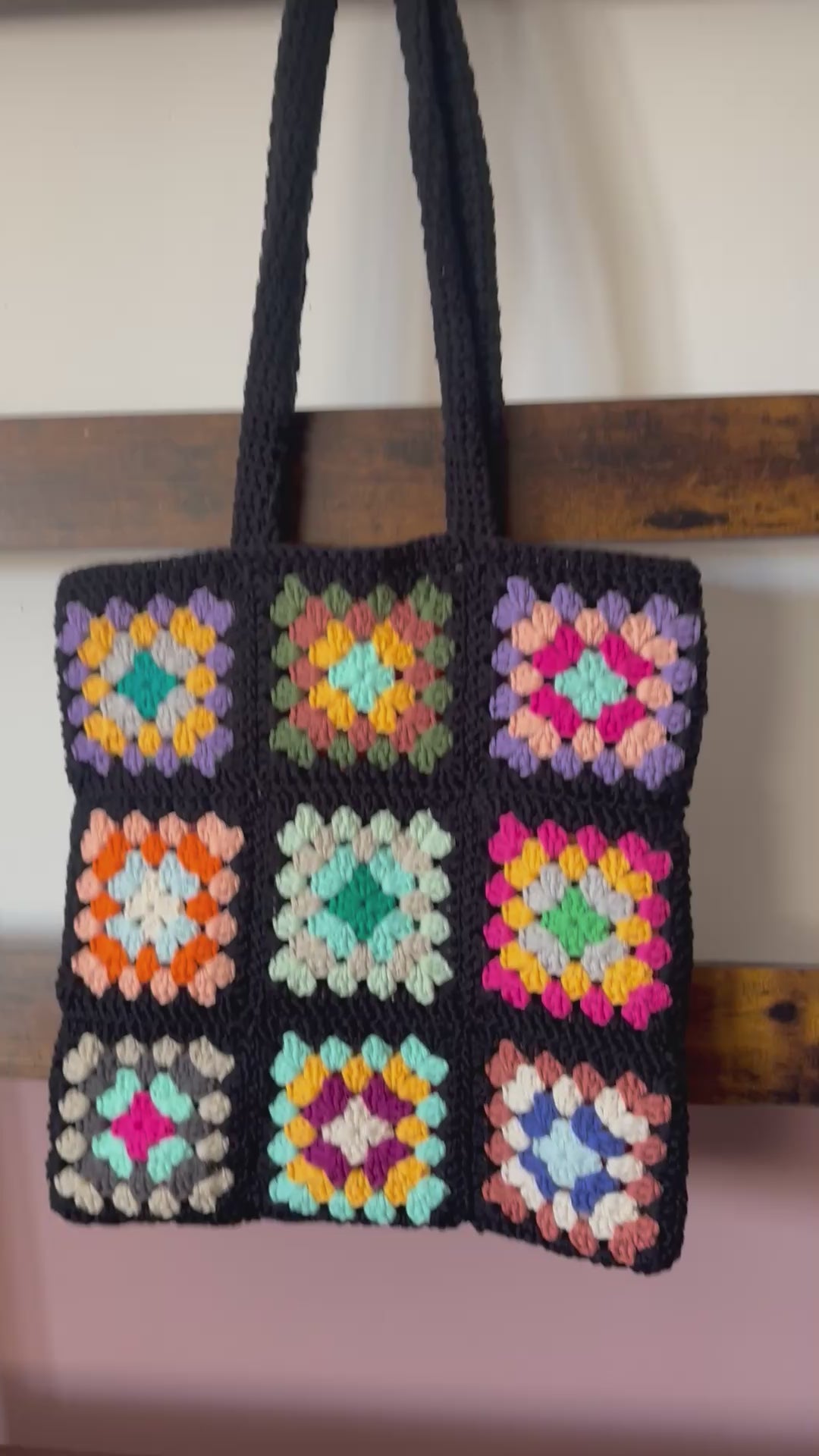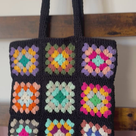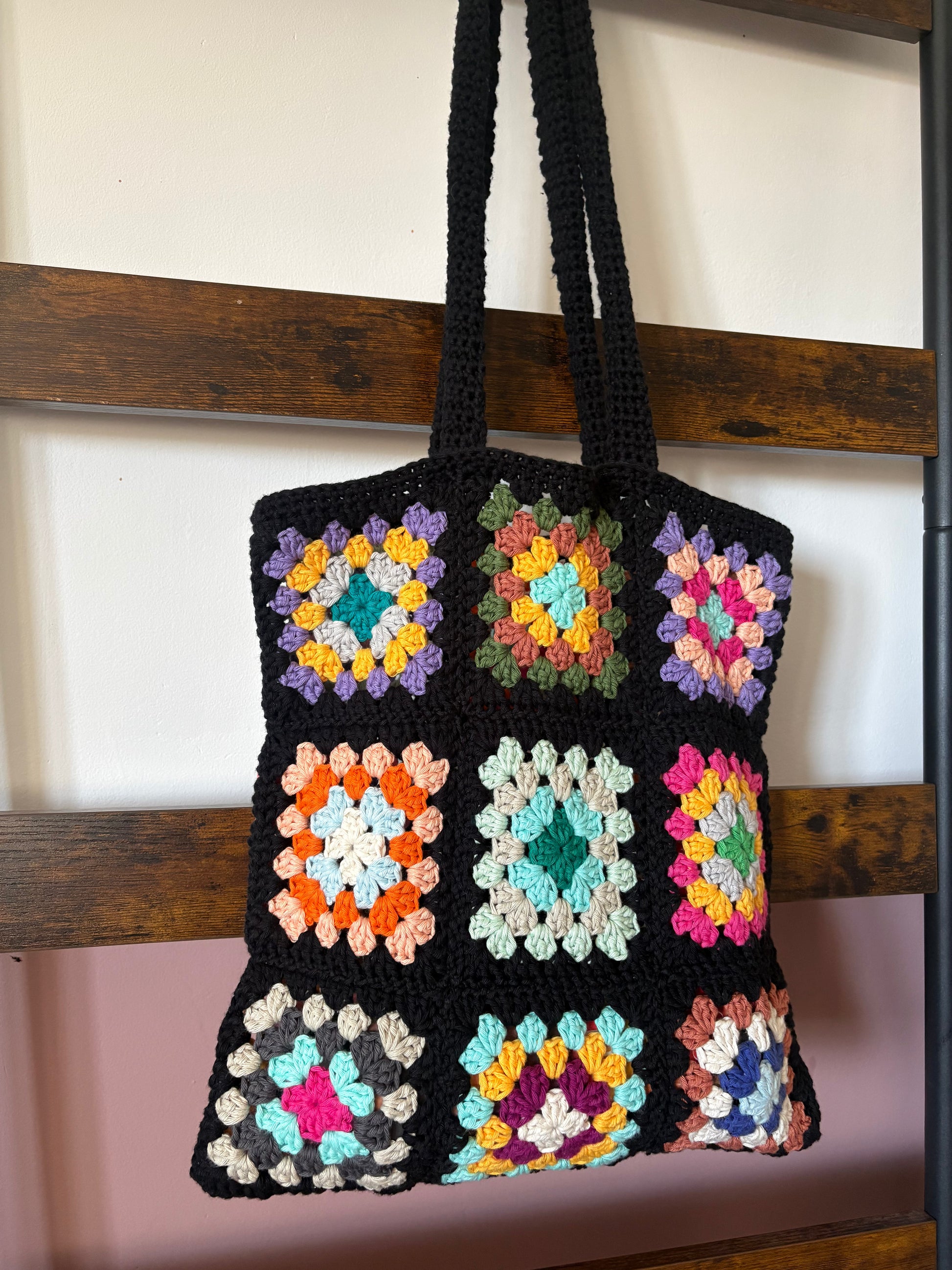 This tote is created from 18 classic granny squares, featuring an easy‑to‑assemble design and sturdy straps that help it maintain its shape.